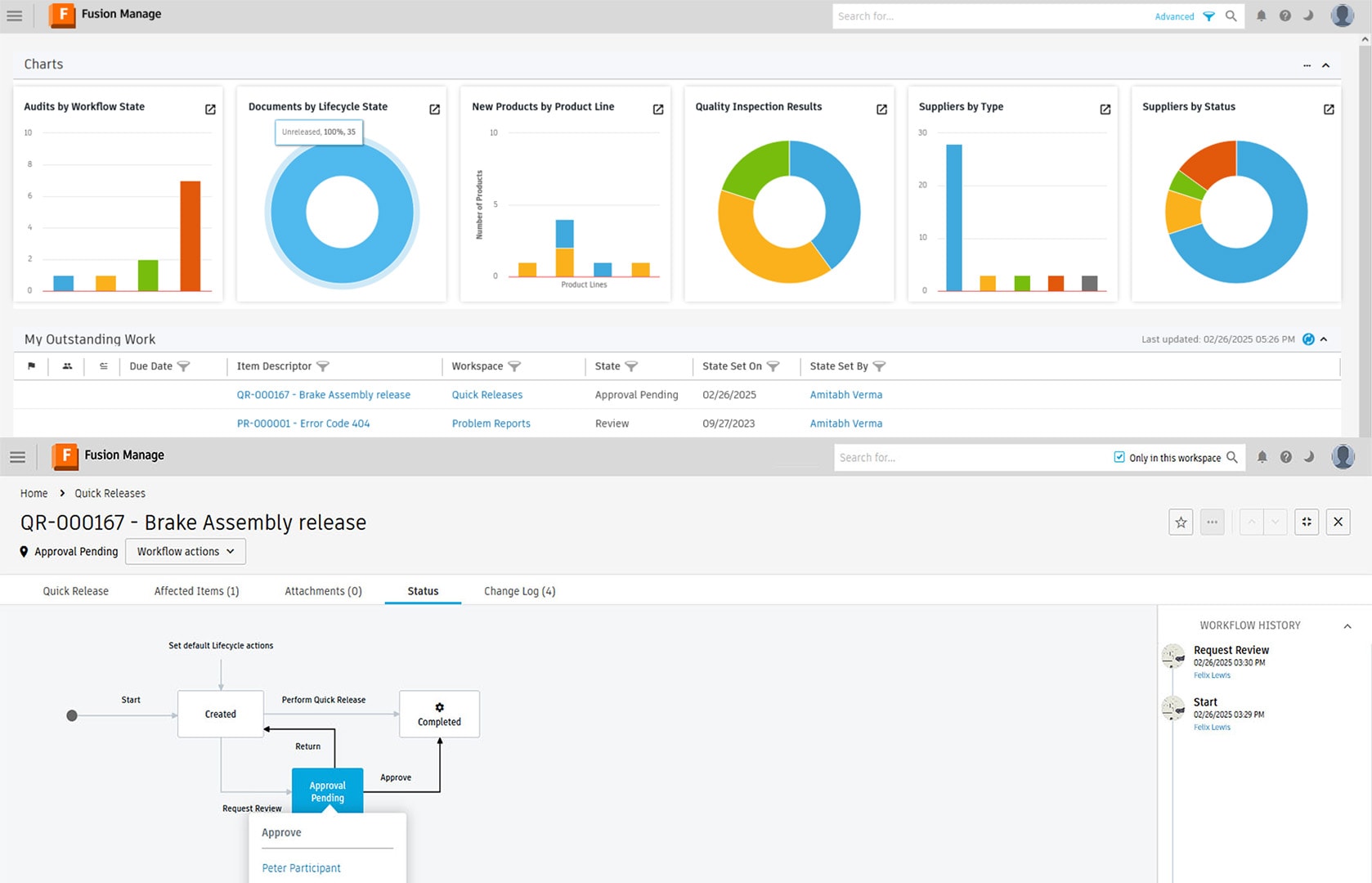 Fusion Manage 是一款云 PLM 解决方案,提供流程管理功能,使制造商能够对产品开发和协作工作流进行数字化转型。Fusion Manage 提供了一套全面的核心 PLM 流程,包括新产品引入 (NPI)、创意管理、要求管理、BOM 表管理、变更管理、供应商管理和质量管理。