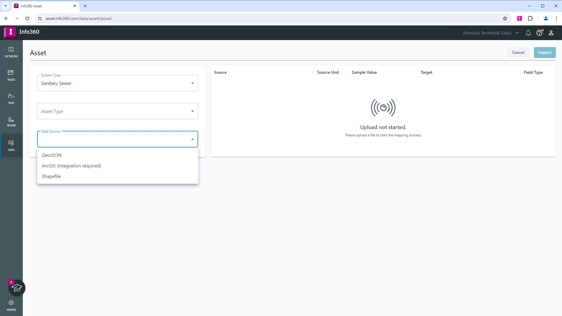 查看导入的数据历史记录。引入 GeoJSON 格式的 GIS 数据(包括点、线和多边形),以用于背景地图并改进风险概况。以 CSV 格式导入用户定义的表,其中包含可在风险分析中使用的字段。