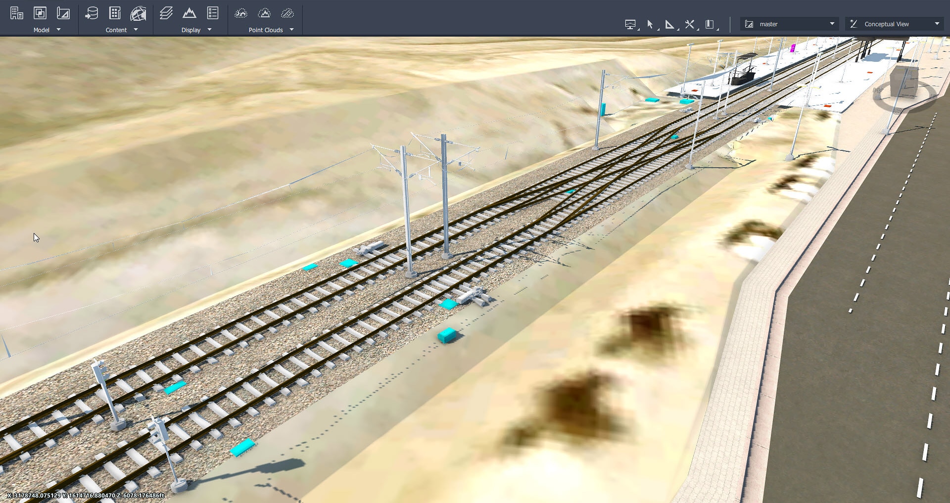 使用内置工具设计轨道和转辙器并设置组件,如路基改善层和道碴。分析铁路道路并计算数量以优化成本和影响。
