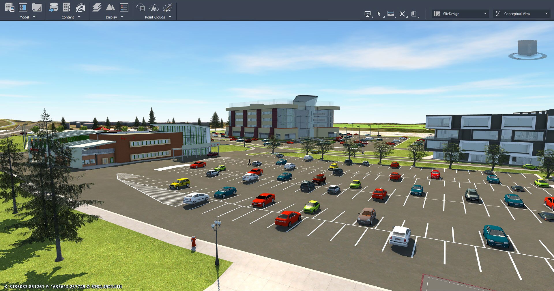 从各种来源生成基本模型,包括调查级别地形数据。布置地块、放坡、覆盖范围、城市设施等以完成设计概念。