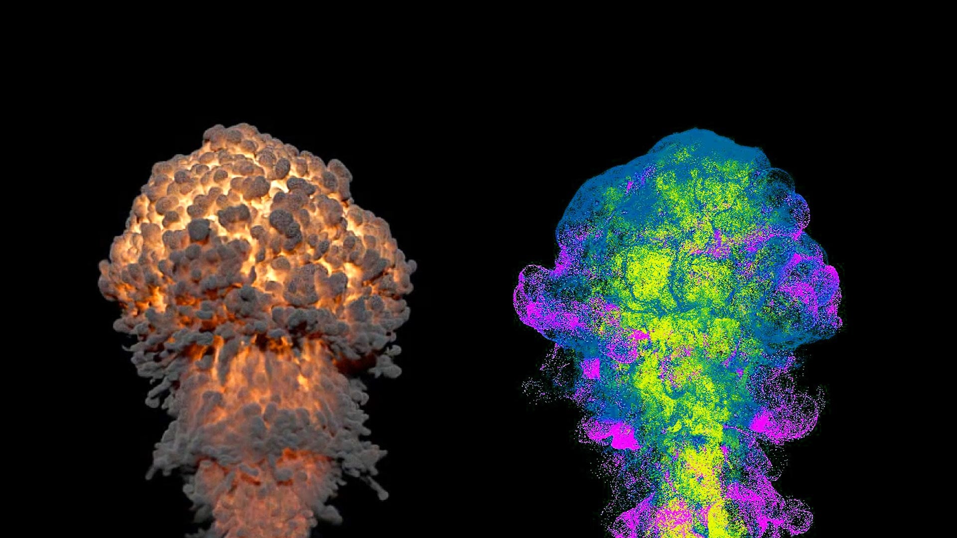 借助 Maya 中的 Bifrost 图表和模拟功能,可生成使用 Arnold 渲染的彩色粉末爆炸效果
